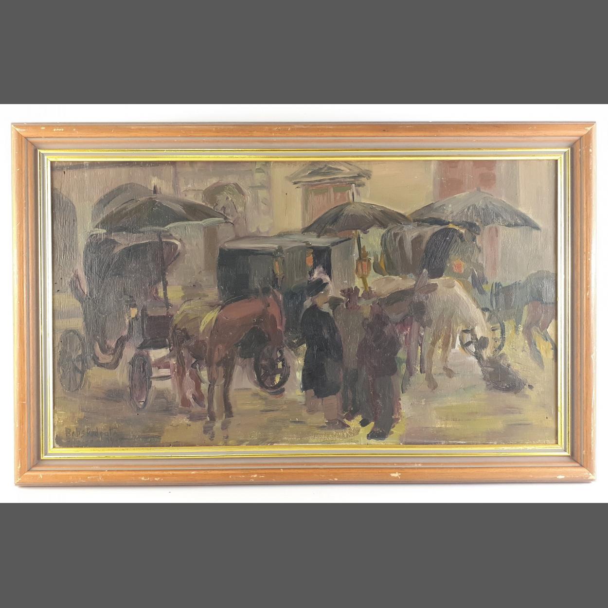 ORIGINAL BARBARA 'BABS' REDPATH (SCOTTISH b. 1924), Firenze dated 1948. Study of street scene with carriages etc. Oil on board. Frame size 68cm x 40cm. approx