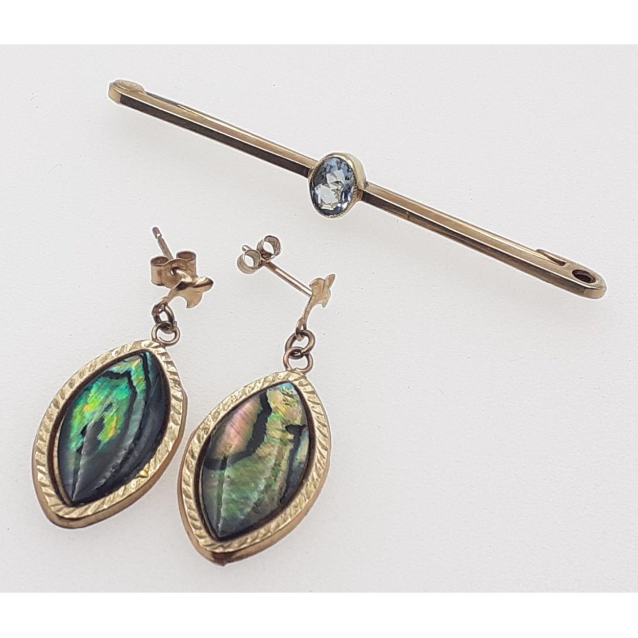 A 9ct stamped bar brooch 2.1g approx and a pair of earrings stamped 9ct to the stem, 1.2g approx. Total gross weight 3.35g approx