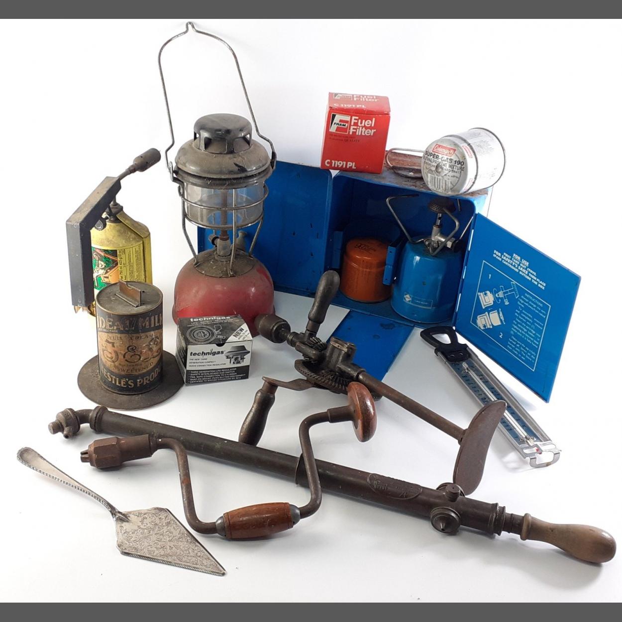 A box of interesting tools, a shed find! to include a Tilly Lamp, camping stove, Knee Brace and others.
