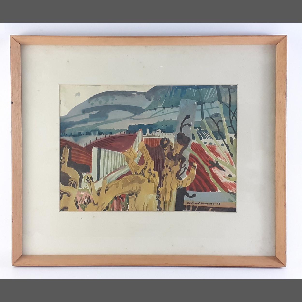 An original framed watercolour by RICHARD DEMARCO CBE (Scottish b. 1930 -), titled 'The Pentland Hills' and exhibited at the Hendry Decor Art Gallery of Edinburgh in 1964. Frame measures 51 x 43cm approx, visible work 33 x 24cm approx