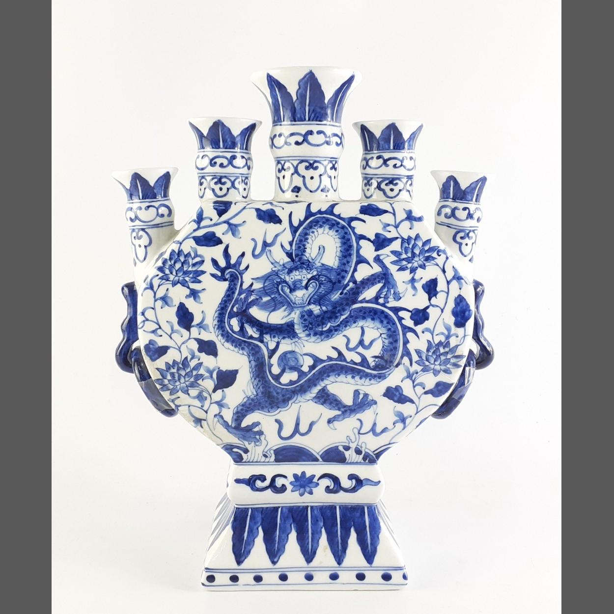 A vintage blue/white Asian tulip bowl with dragon motif standing 25cm tall with Chinese marks to base. No damage.