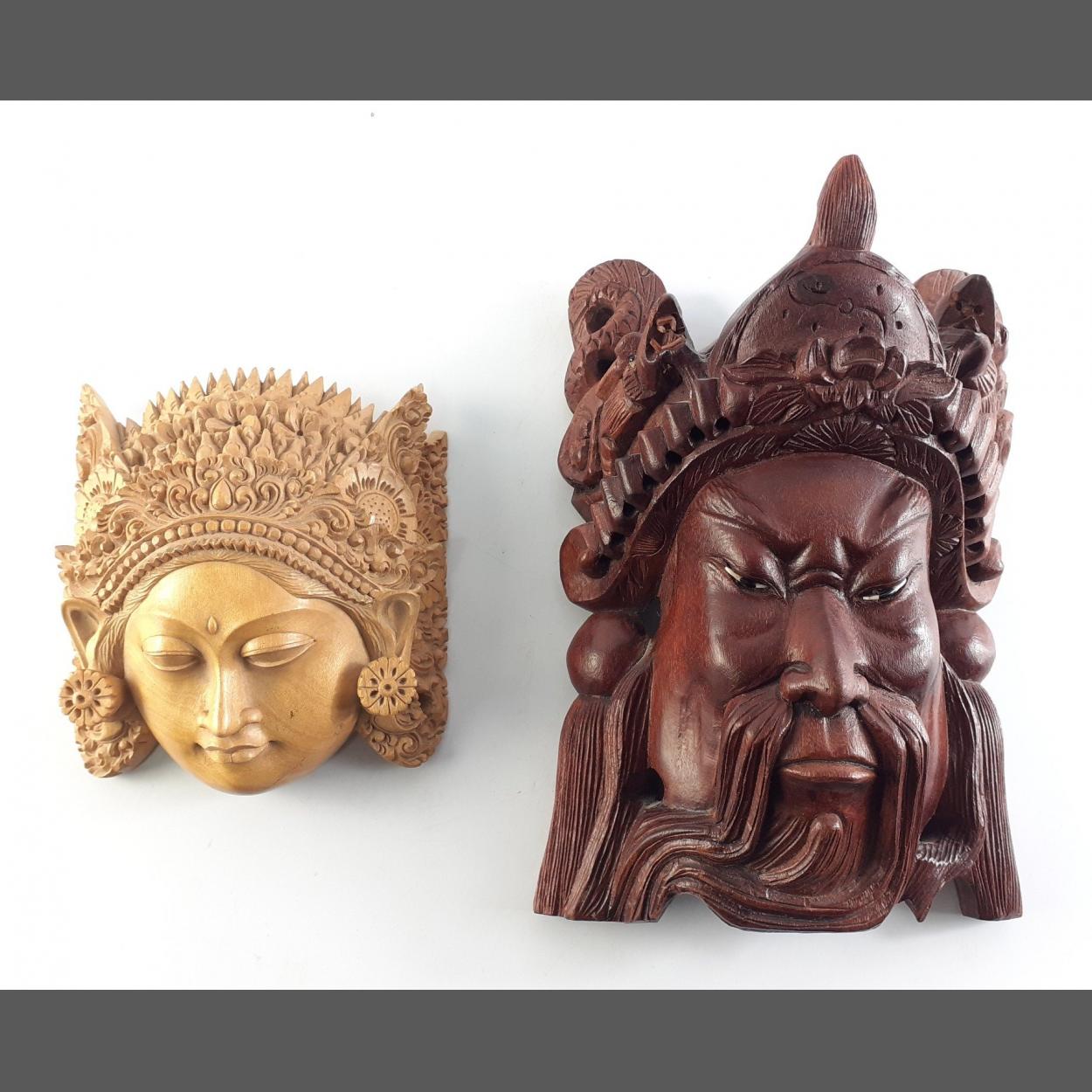 Two wooden Far Eastern face masks one gent 20cm approx and the other 14cm approx