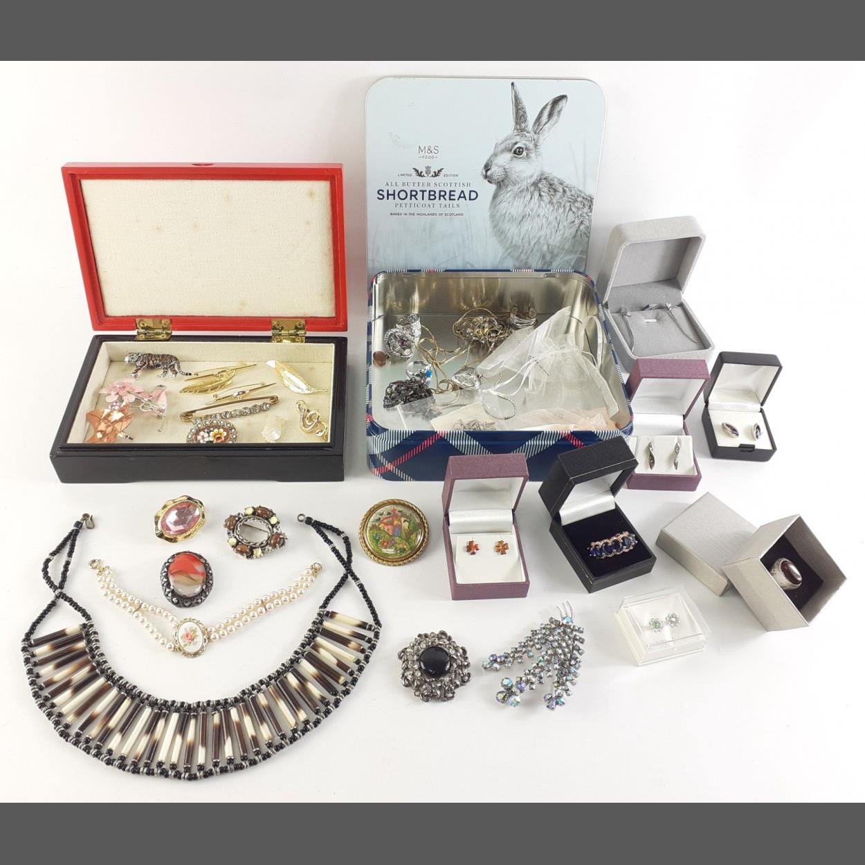 BOXED SETS - A tin with an assortment of costume jewellery including earrings and plated/rolled gold chains, some empty jeweller's boxes, and a small jewellery box with contents of vibrant costume jewellery including a micro-mosaic brooch.