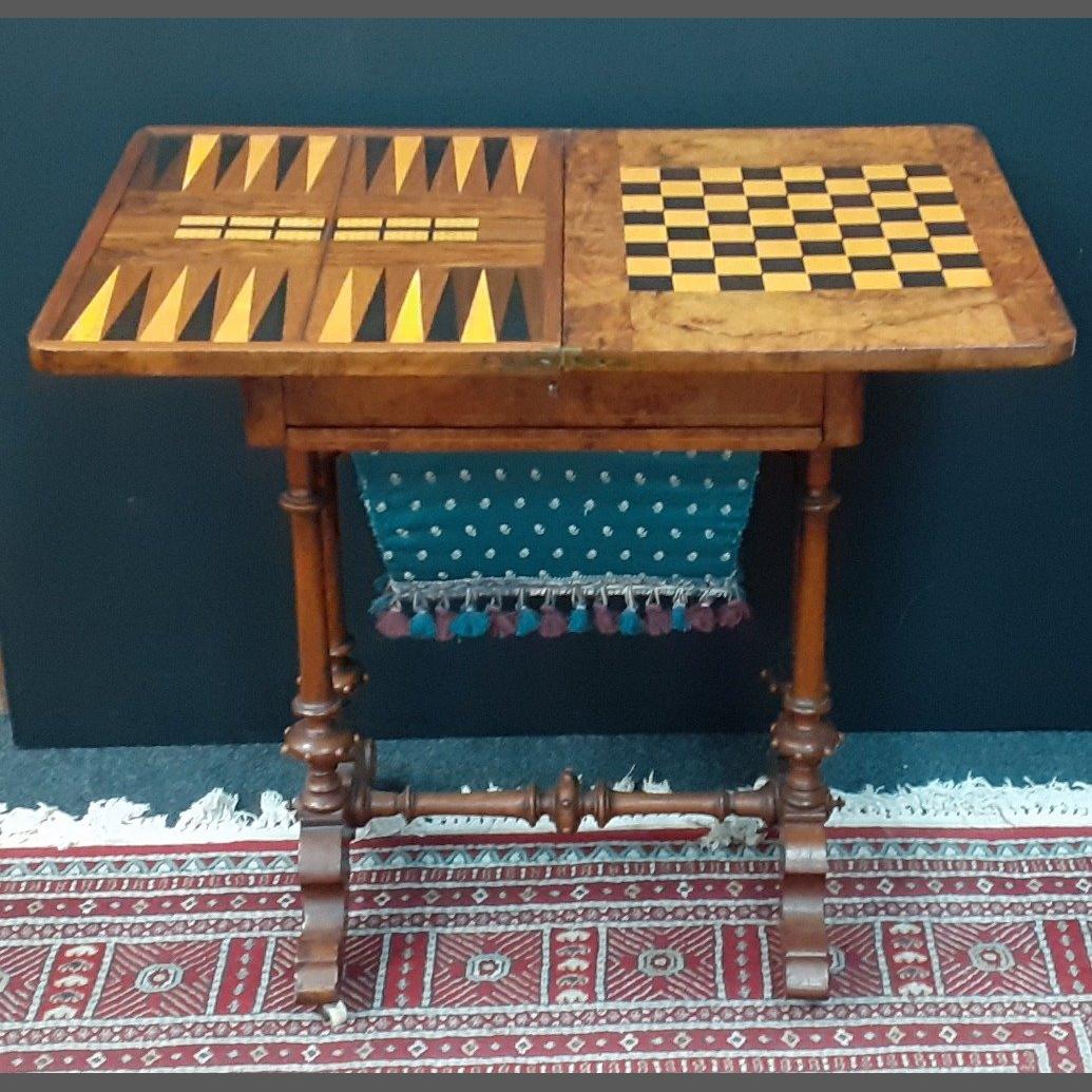 A stunning Burr Walnut Victorian combination workbox and gaming table. The piece presents beautifully and stands on original ceramic casters. The finish is excellent and the swivel board appears little used. The fabric is an older replacement. Stands 73cm tall approx. and is 80cm wide when opened.