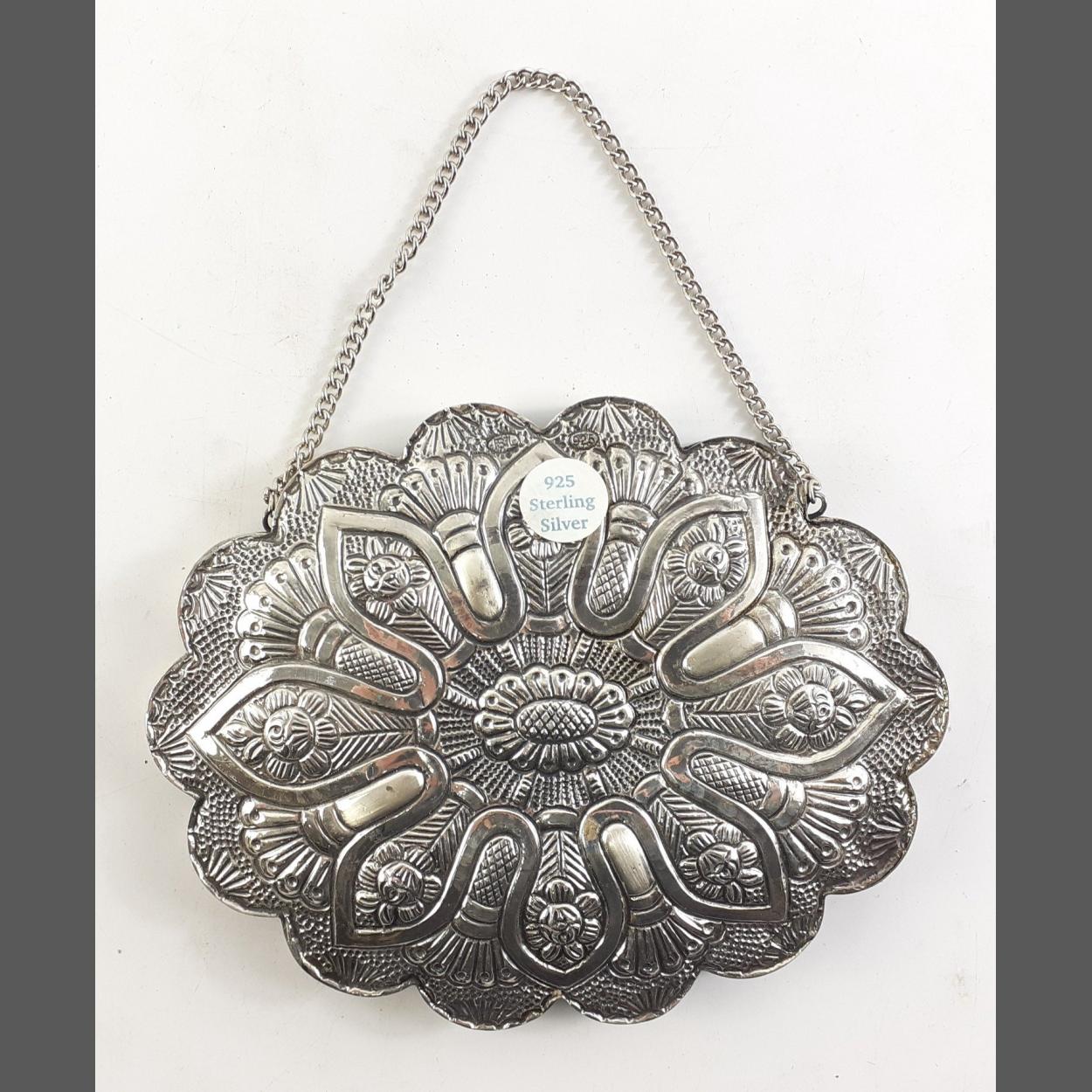 A solid little 925 sterling silver framed mirror on chain. 14cm across and weighs 290g approx