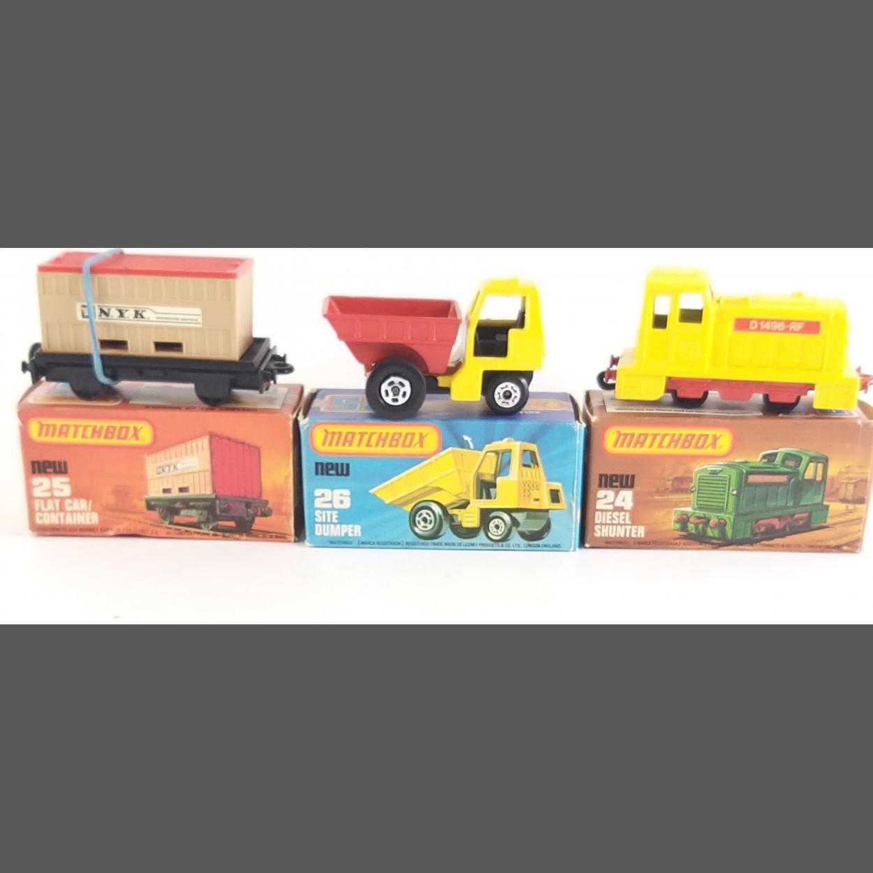 Three MATCHBOX Diecast models to include a 24 Diesel Shunter, 25 Flat Car, 26 Site Dumper. All boxed good condition.