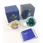 Two SELKIRK GLASS paperweights in boxes. Green bubble one is dated 1991 to base and a cute duck.