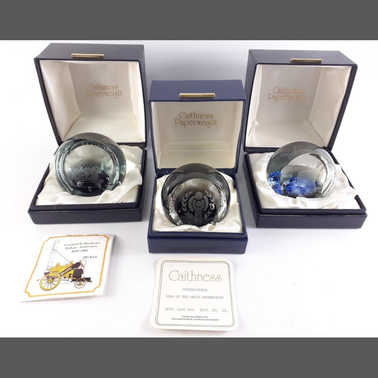 Three CAITHNESS GLASS paperweights in presentation gift boxes. International CHILD OF THE YEAR (31/250), THE YEAR OF THE VIKING, LIVERPOOL & MANCHESTER Railway. All in good boxed, well stored condition.