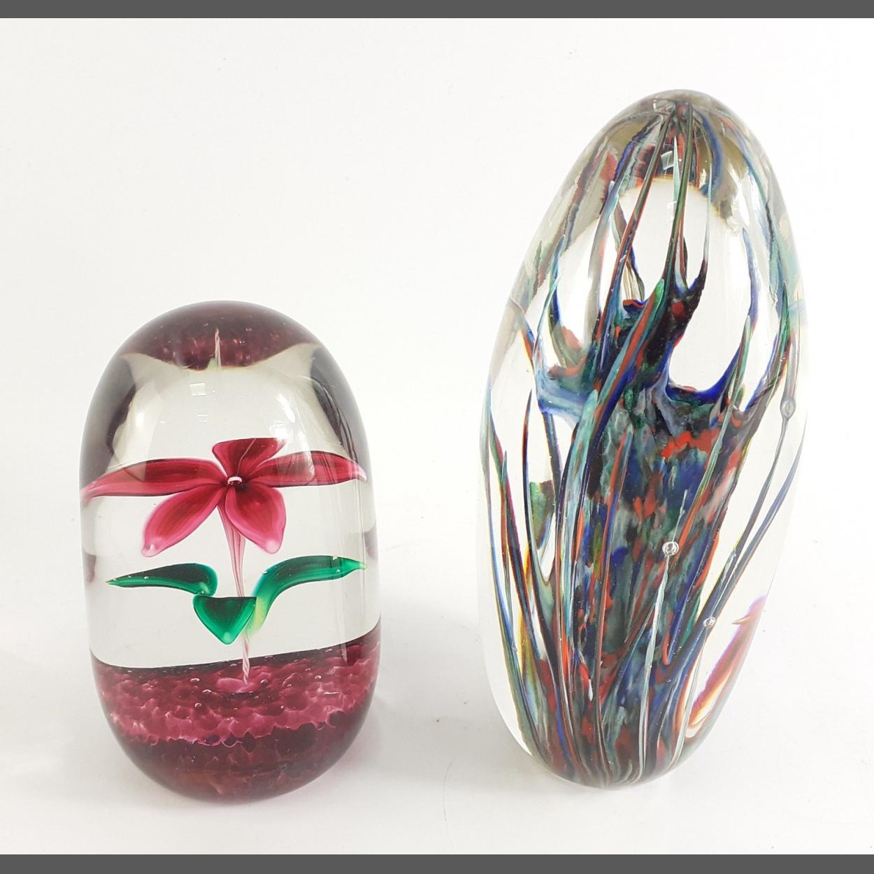 STRATHEARN paperweights. A gorgeous twist style 13cm and a lovely red flower 9cm approx. Both in excellent condition with labels to base.