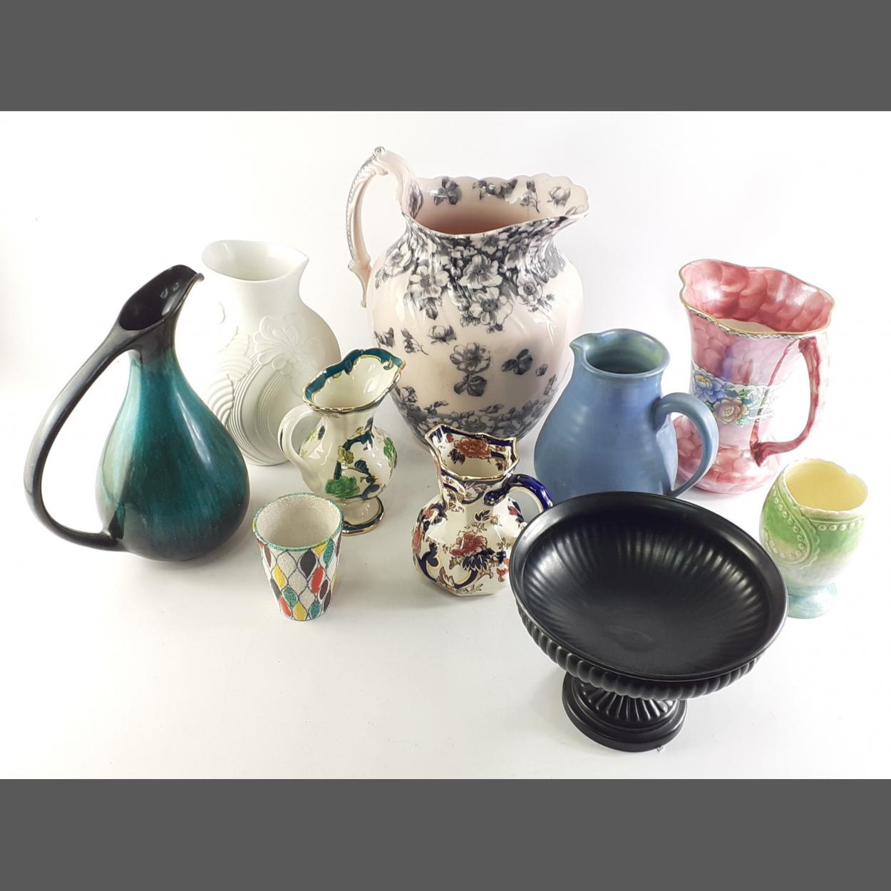 A collection of good quality ceramic decorative pieces to include MALING, BLUE MOUNTAIN, KAISER white vase, a large ewer in blue and white and much else,