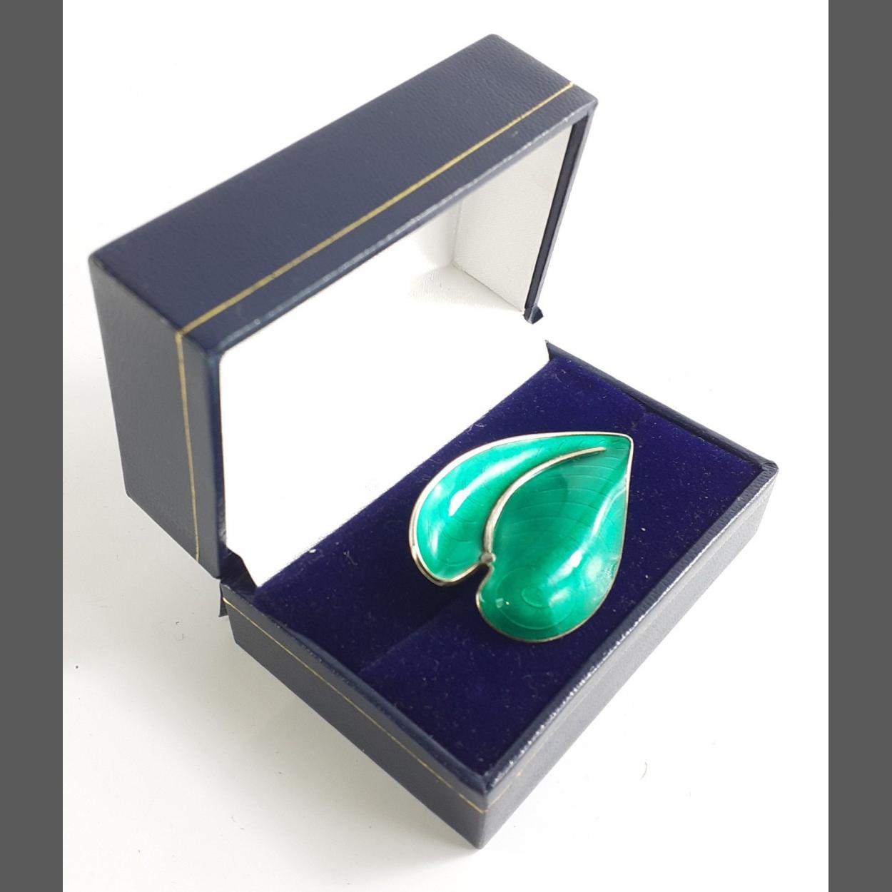 A Norwegian sterling silver enamel leaf brooch in lovely condition. 4cm, gross weight 9.5g approx. A beautiful piece. Possibly Einar Modahl.