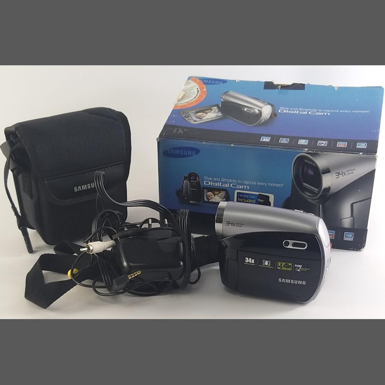 A boxed SAMSUNG VP- D381camcorder with accessories.