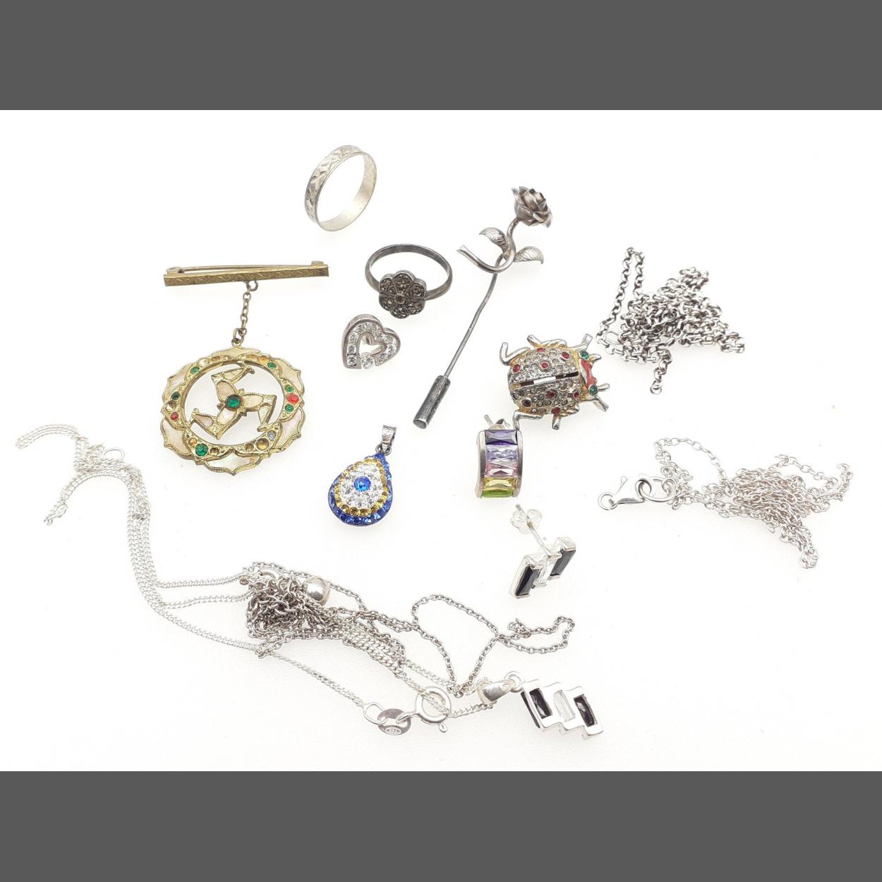 QUALITY! - A collection of mainly silver and some costume jewellery to include an ISLE OF MAN Triskelion, composed of three armoured legs with golden spurs pin brooch - rings and pendants etc - gross weight for info 32g approx