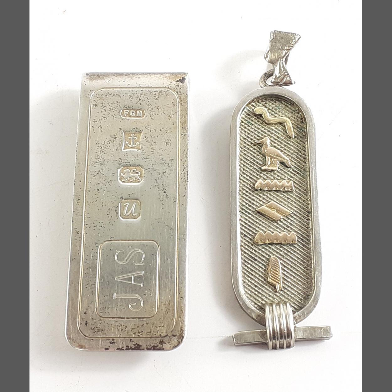 An unmarked EGYPTIAN cartouche pendant in white metal with also a SUBSTANTIAL silver fully hallmarked tie-clip with engraved initials JAS - dimensions 5cm x 1.8cm approx and weight 17.60g approx