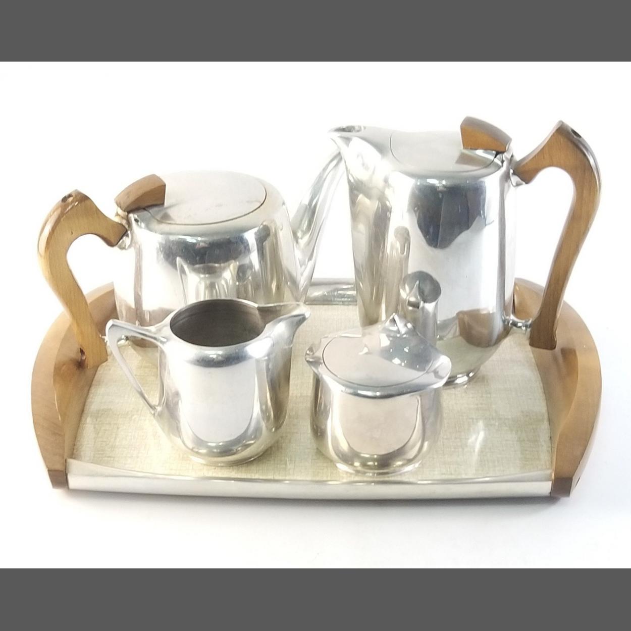 PICQUOT WARE tea set, comprising tea pot, water pot, milk and sugar and with tray. All in good condition.