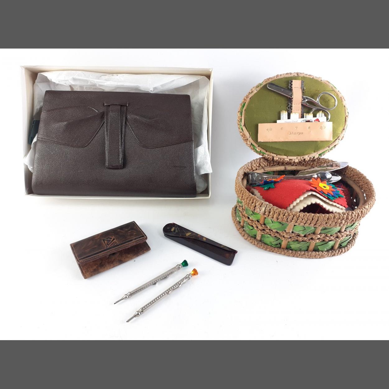 A cute small sewing box with contents, a vintage handbag, and a small purse with propelling pencils