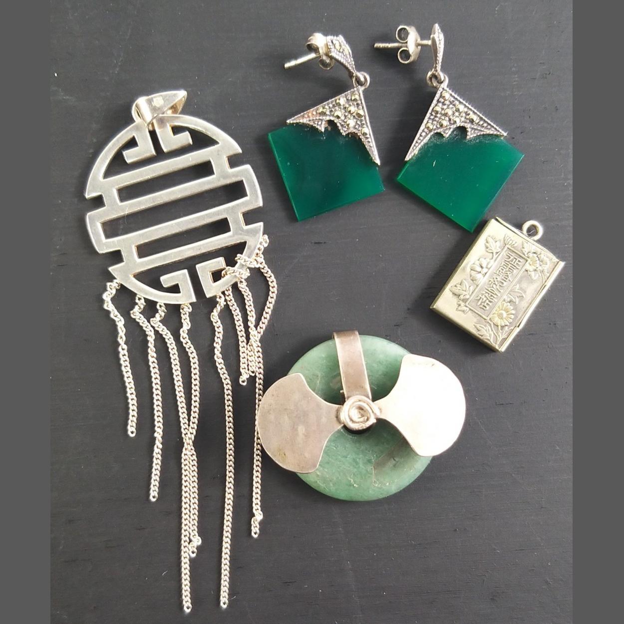 An UNUSUAL ORIENTAL jewellery lot to include three items (two pendants stamped 925 & Oriental hallmarks) and one set of green stone diamond shape earrings marked 925