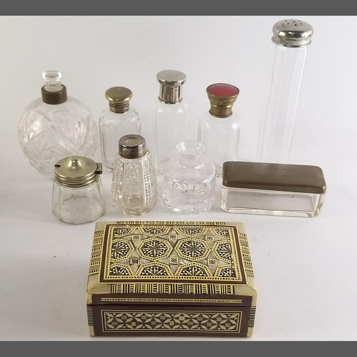 Small lot of pretty lidded bottles, an inlaid Oriental style box. Some interesting pieces.