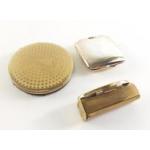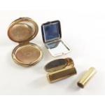 A STRATTON powder compact with fur cover, plus a lipstick holder and a small folding twin-sided mirror.