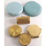 A large French compact with leather pouch plus 2 other compacts, a small decorated box (60mm approx) and one other container