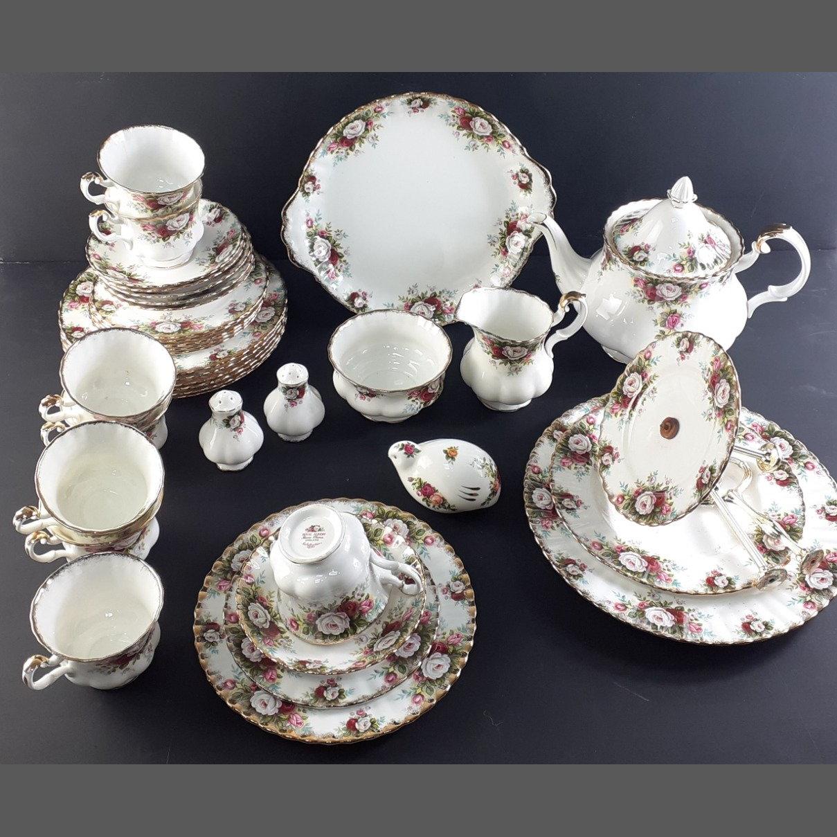ROYAL ALBERT Celebration tea service comprising, large teapot, 6 cups, 8 saucers, side plates, sandwich plate, cake stand (missing bottom screw), sugar and milk, salt and pepper. Minor cracks noted to 2 cups but otherwise good condition