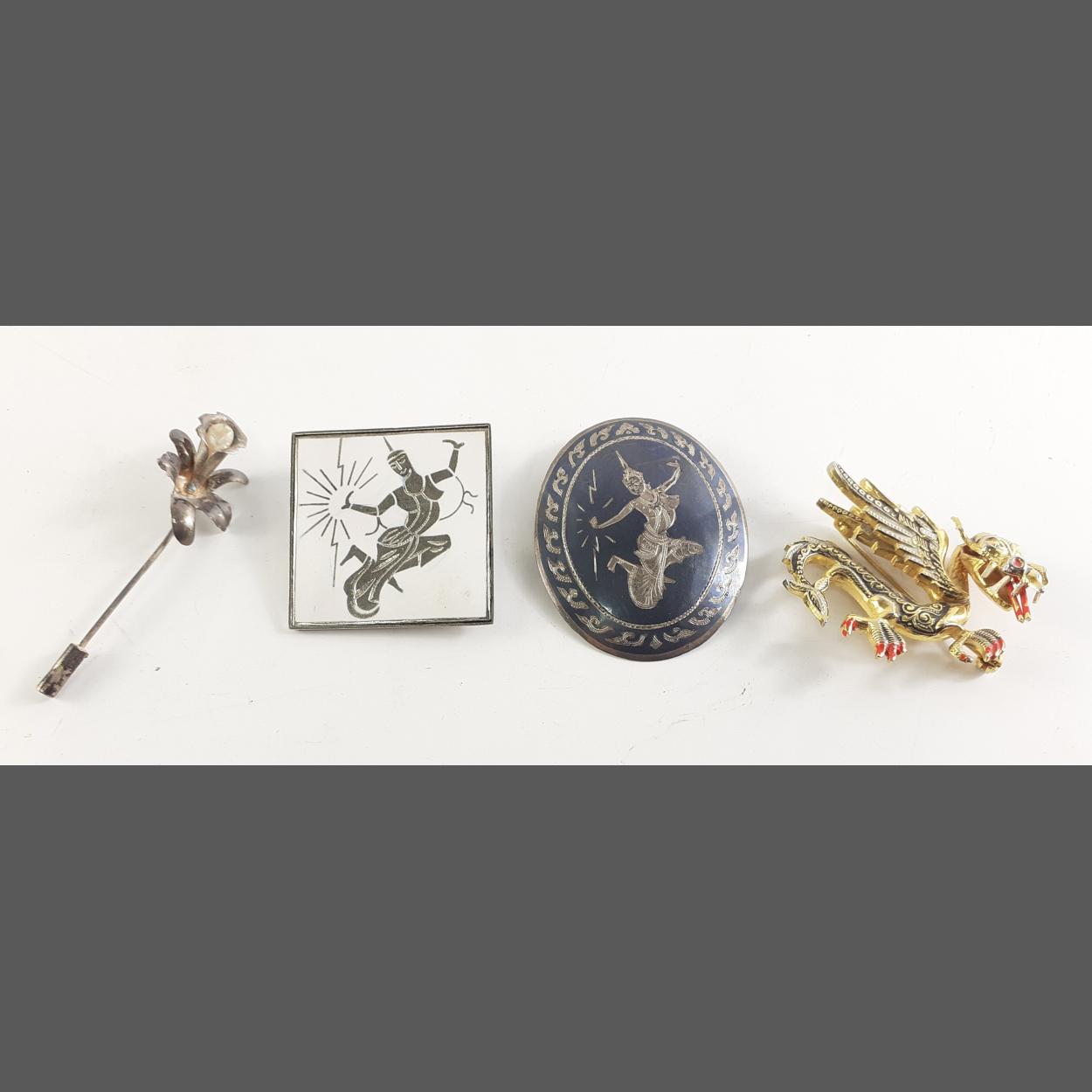Three Siam inspired pieces to include superb gilt dragon, sterling silver shield style goddess and two others.