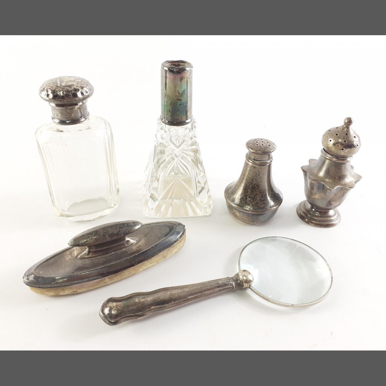 A small silver collection to include nail buffer, magnifying glass, cruet set and two silver topped bottles. All silver hallmarked