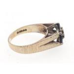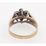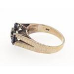 A ladies dress ring stamped 375 and set with 6 blue stones surrounding a clear stone. Size L, gross weight 2.90g approx