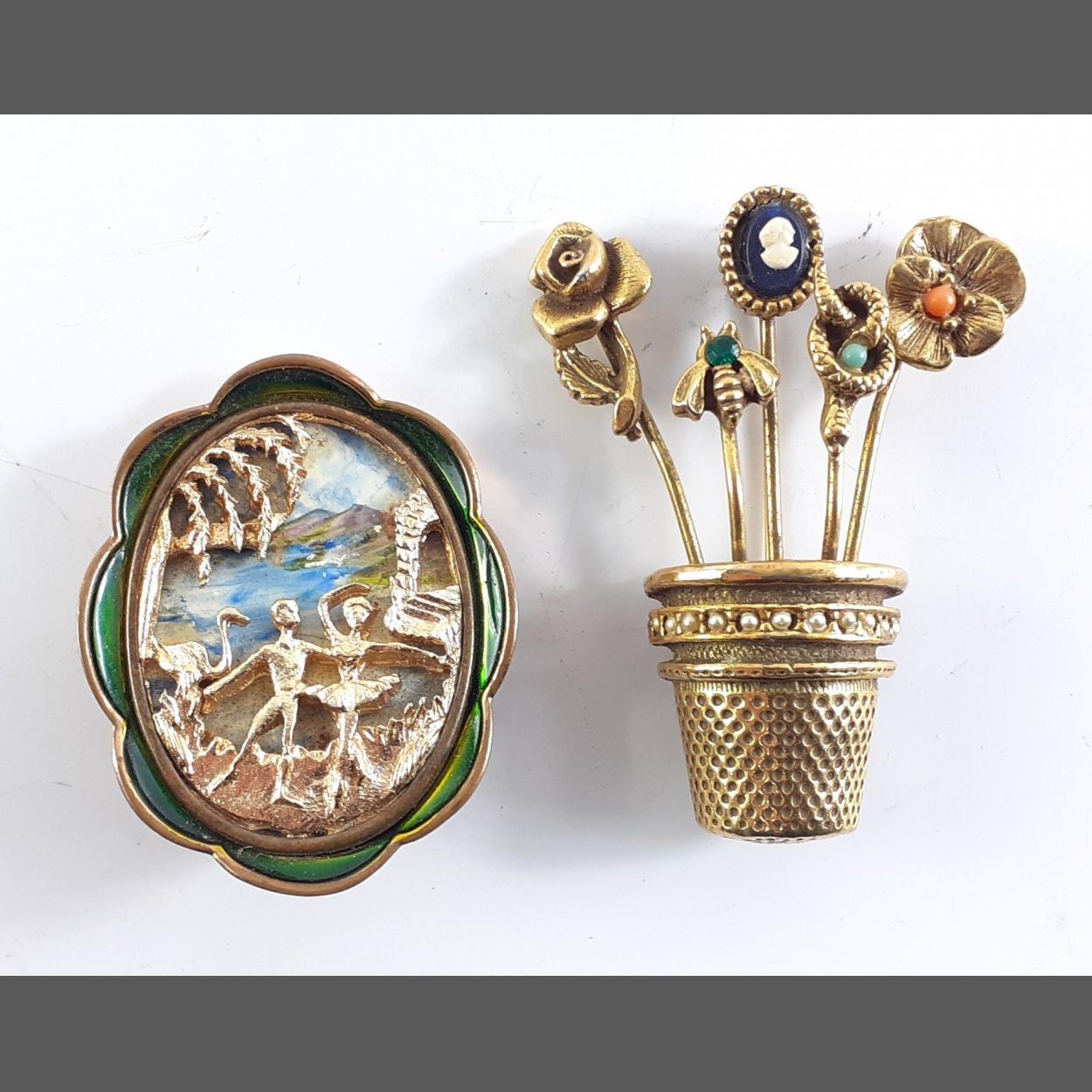Two very attractive large brooch pins. An upside down thimble with floral pins 5cm and a TLM stamped ornate portrait style brooch 4cm approx. Two beautiful pieces.