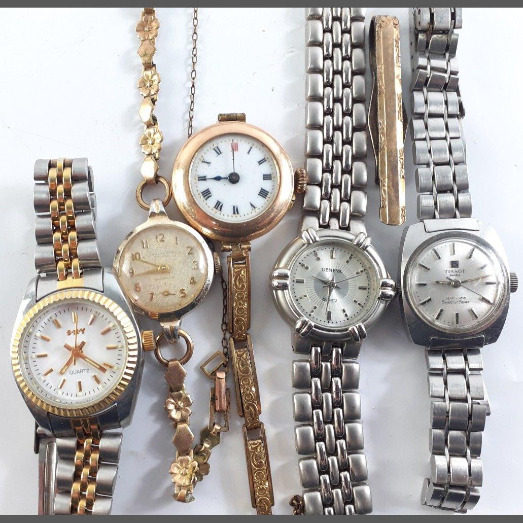Five ladies cocktail watches by TISSOT, GENEVA, etc plus a 9ct gold on silver tiepin.