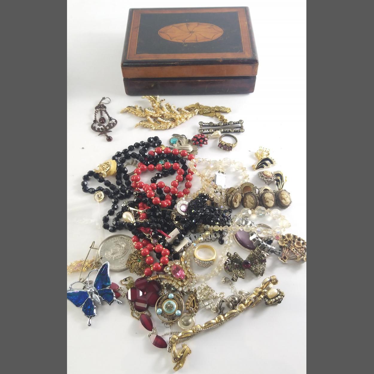 A small wooden jewellery box with interesting contents to include vintage and antique brooches, bracelets, necklaces etc
