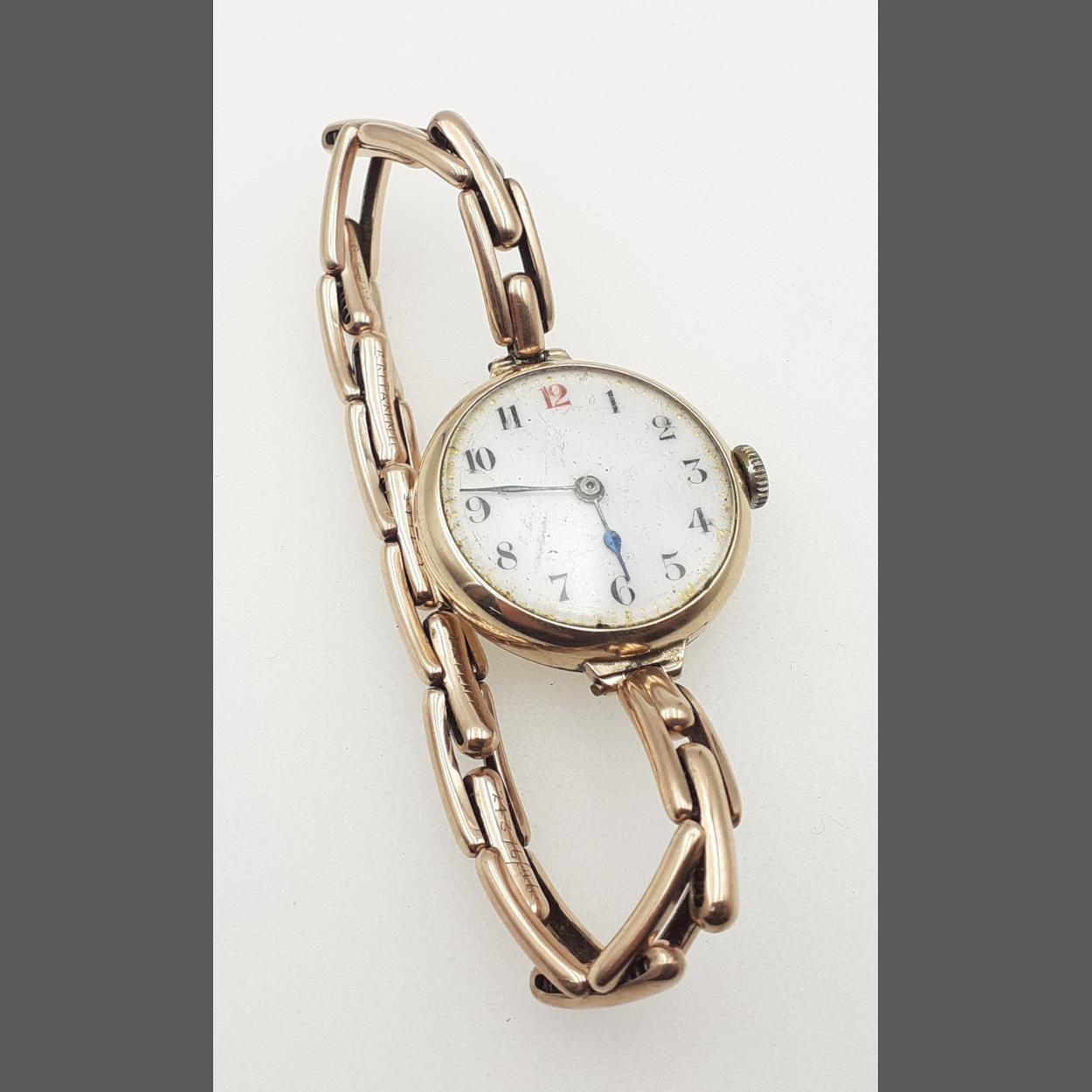 A 375 stamped ladies watch with rolled gold strap. Gross weight 23g approx