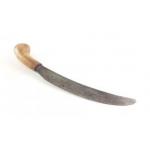 An antique hand-carved handle curved blade knife, c 1850s. Blade length 20cm approx. Total length 27cm approx. Blade is sharpened on the topside.