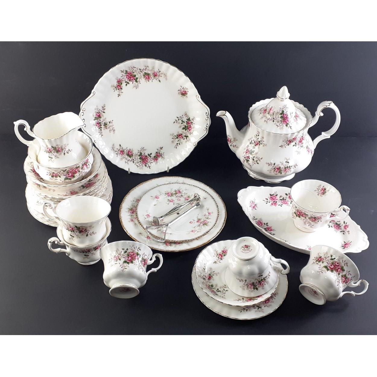 A ROYAL ALBERT Lavender Rose pattern tea service comprising 5 cups, 6 saucers, 6 side plates, cake plate, serving dish, milk jug, sugar bowl, teapot.