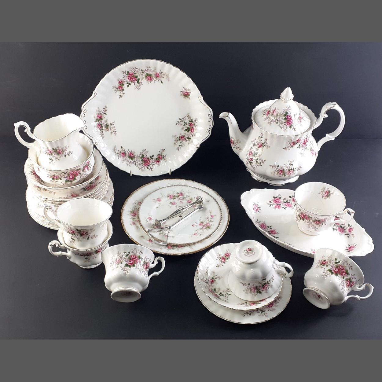 A ROYAL ALBERT Lavender Rose pattern tea service comprising 5 cups, 6 saucers, 6 side plates, cake plate, serving dish, milk jug, sugar bowl, teapot.