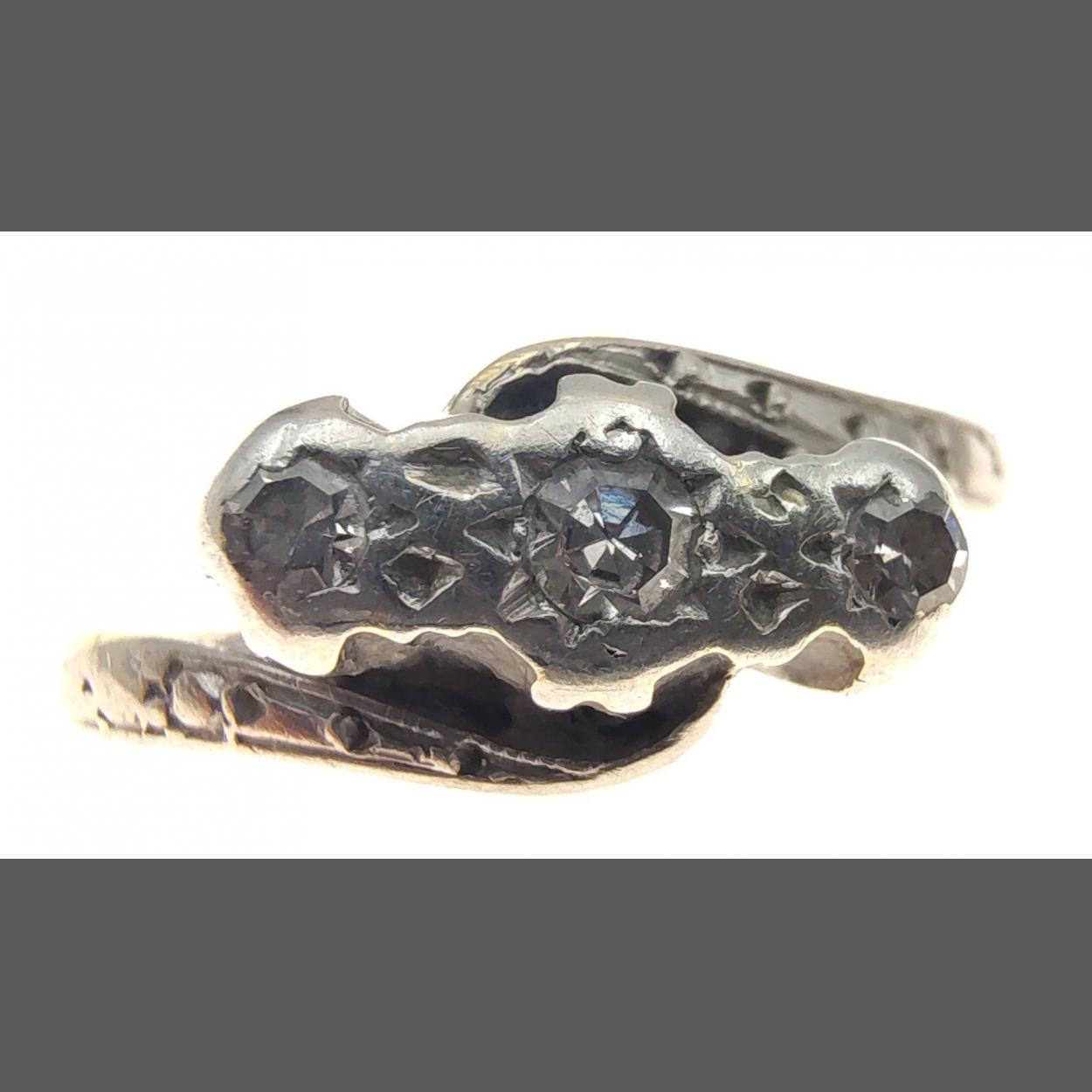 An unmarked yellow metal ring set with three small illusion cut diamonds (tested). Size M. Gross weight 2.2g approx.