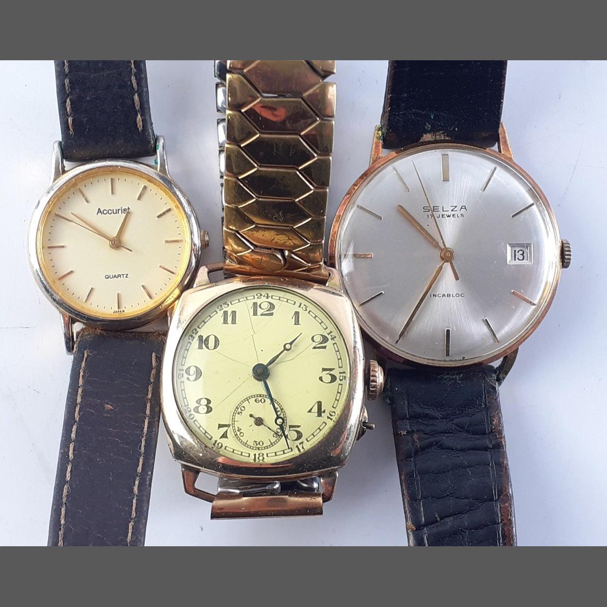 Three watches; A SELZA 17 Jewels gents watch working a gilt watch and a quartz watch.