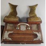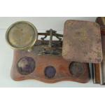 Office paraphernalia including a desk tidy, balance scales, bookends,