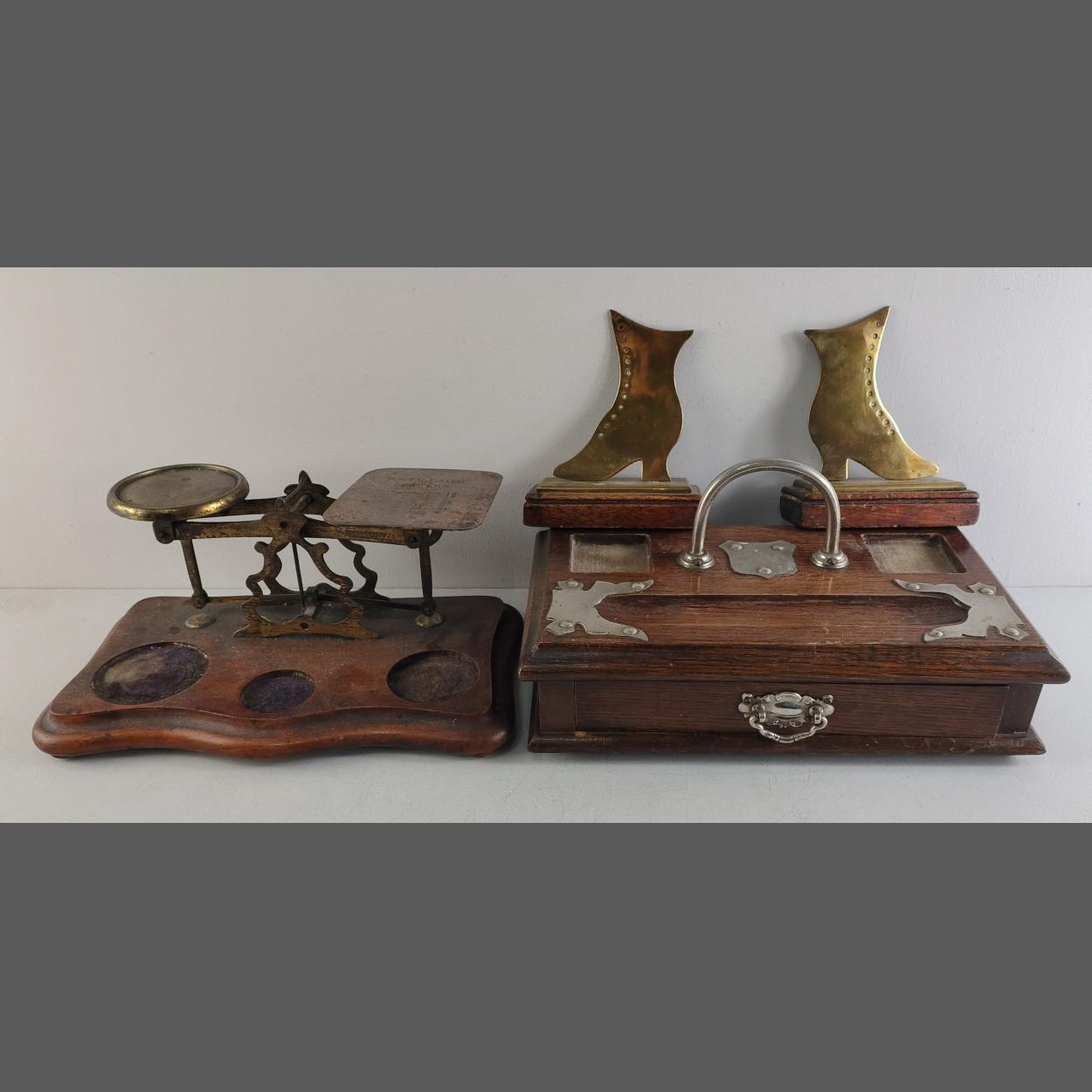 Office paraphernalia including a desk tidy, balance scales, bookends,