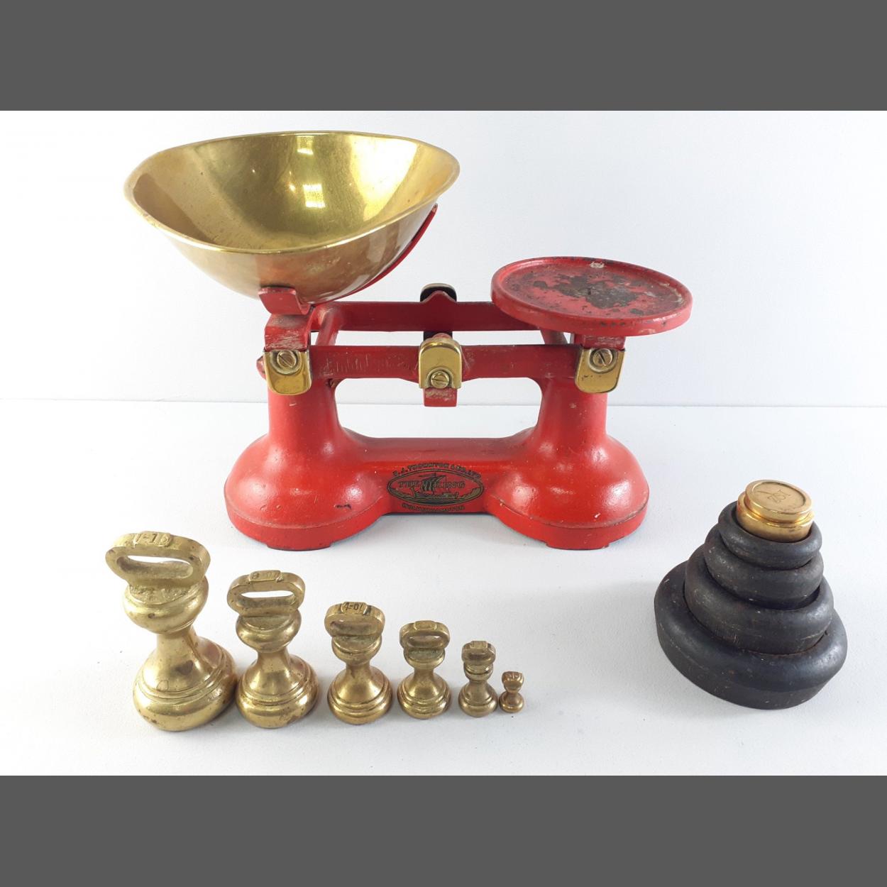 A vintage set of F.J. THORNTON 'The Viking' balance scales with pan and two sets of weights.