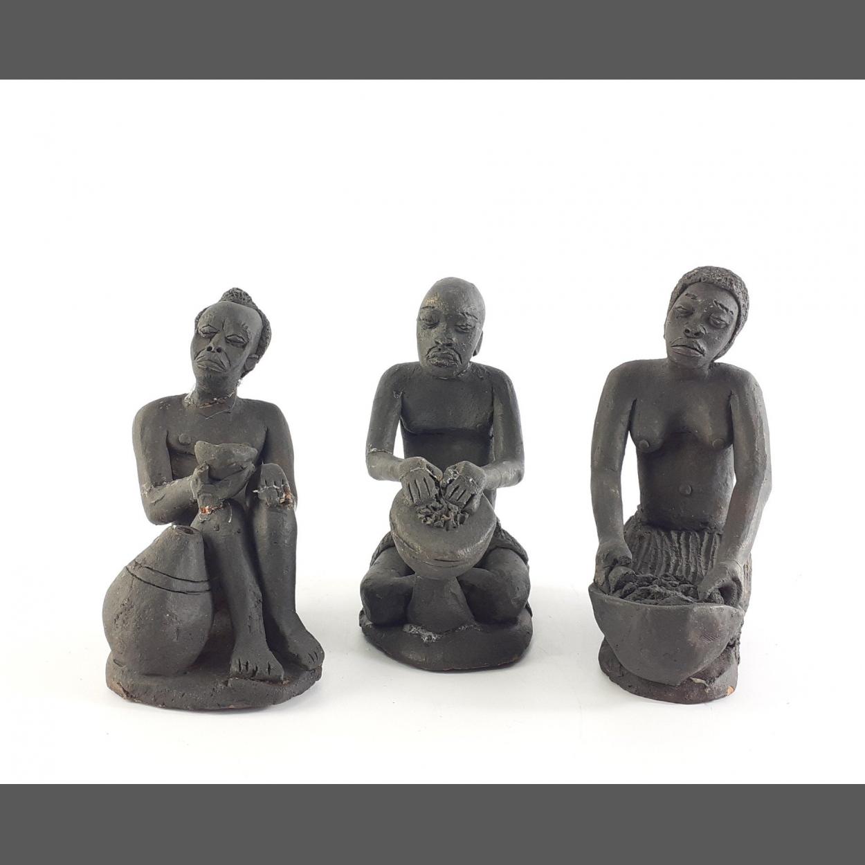 Three stoneware figures, each 10cm approx. Some damage noted.