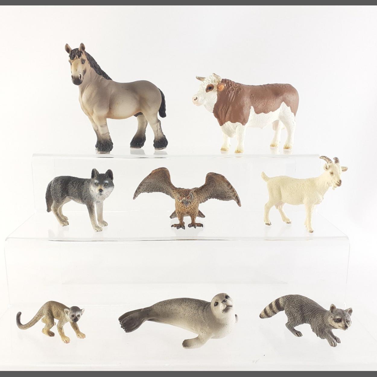 Retired SCHLEICH model animals. Bull, pony, owl, seal etc. Eight pieces all in good well stored condition.