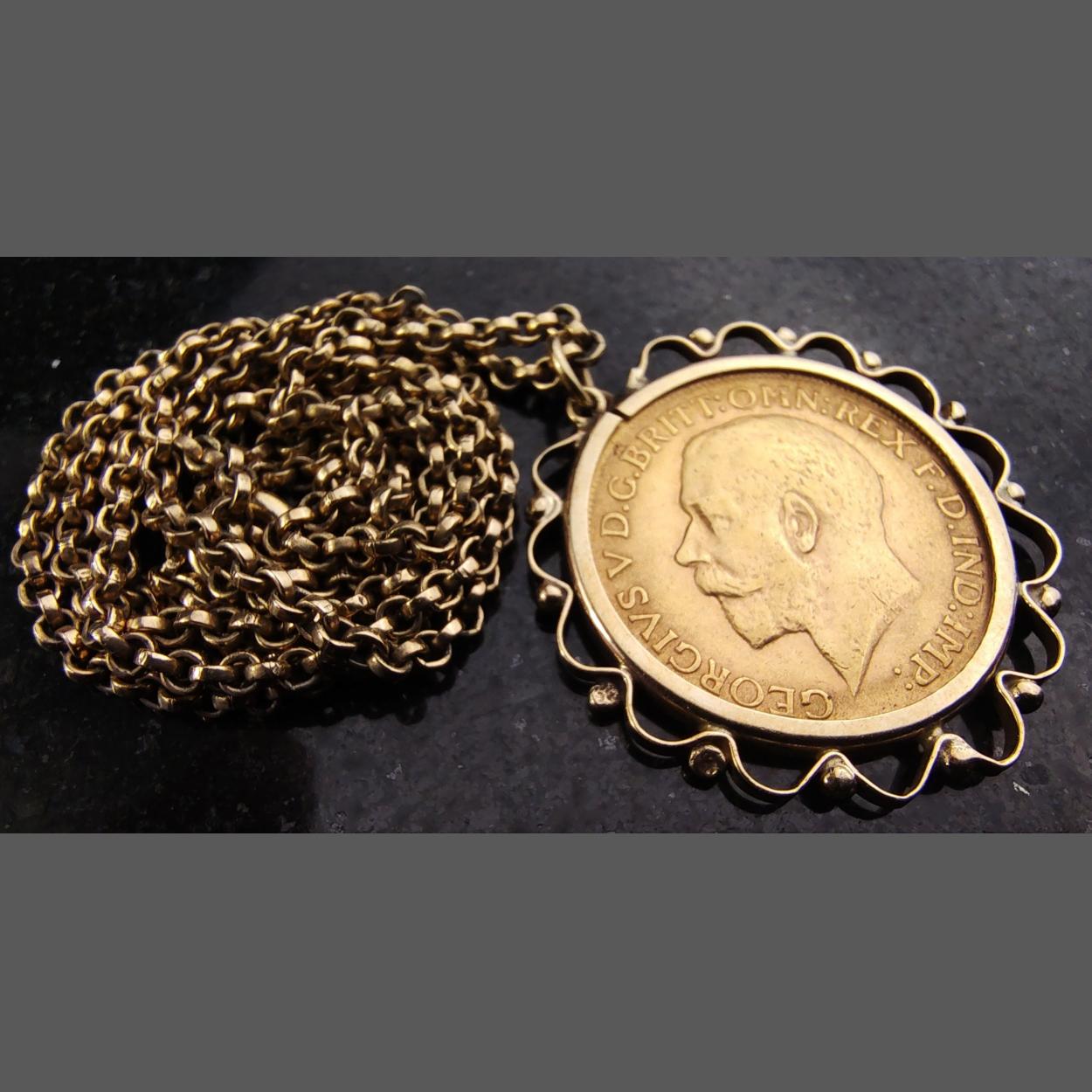A 1912 George V full sovereign with 9ct mount and chain. Total gross weight 17g approx