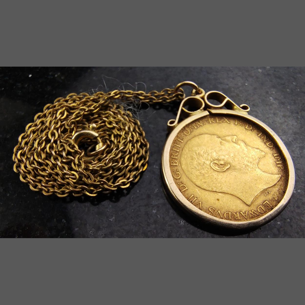 A 1907 Edward VII half sovereign in 375 mount and RG chain. Gross weight excluding chain 5g approx.