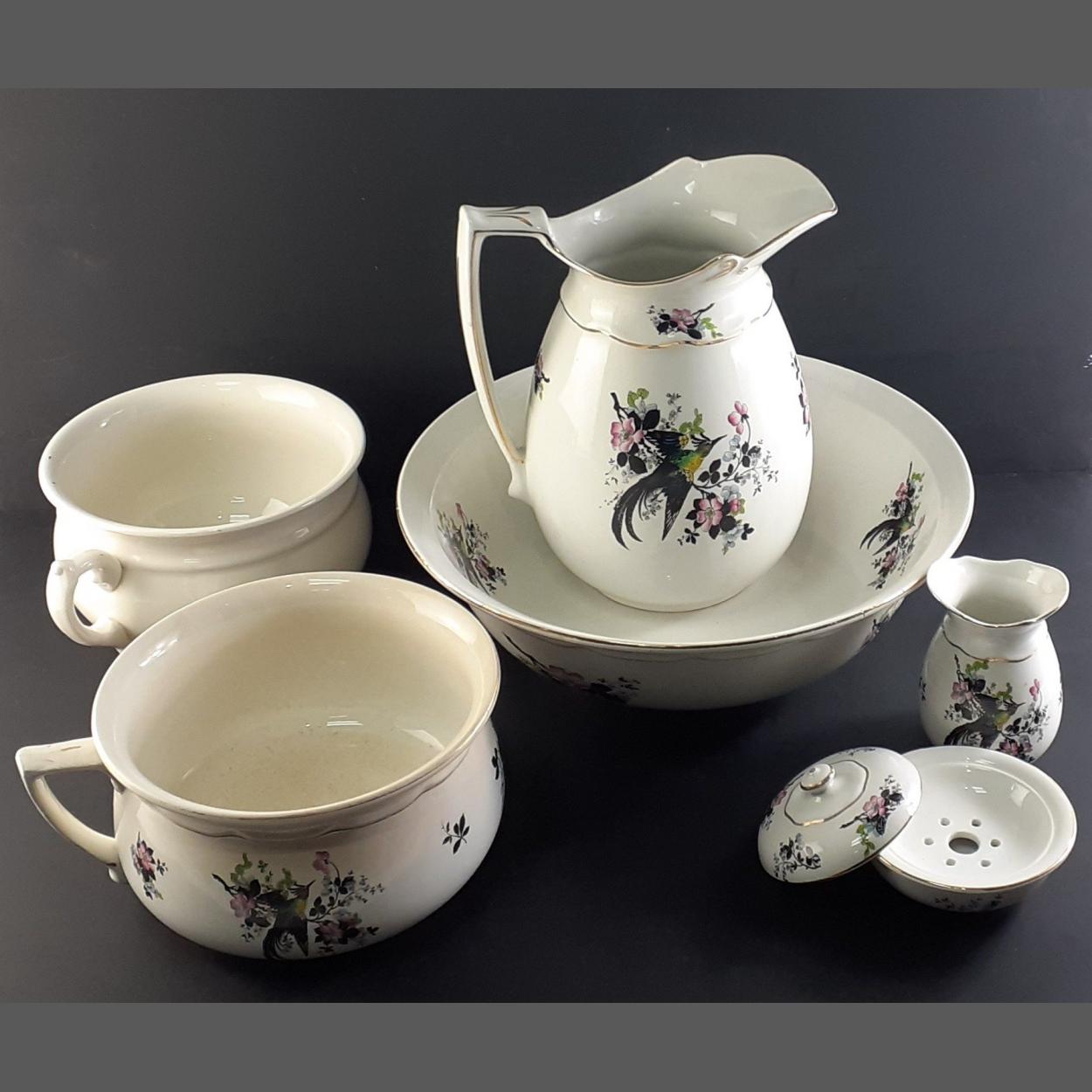 Large antique with floral decoration ewer and bowl and other pieces. The small bowl with damage otherwise good condition.