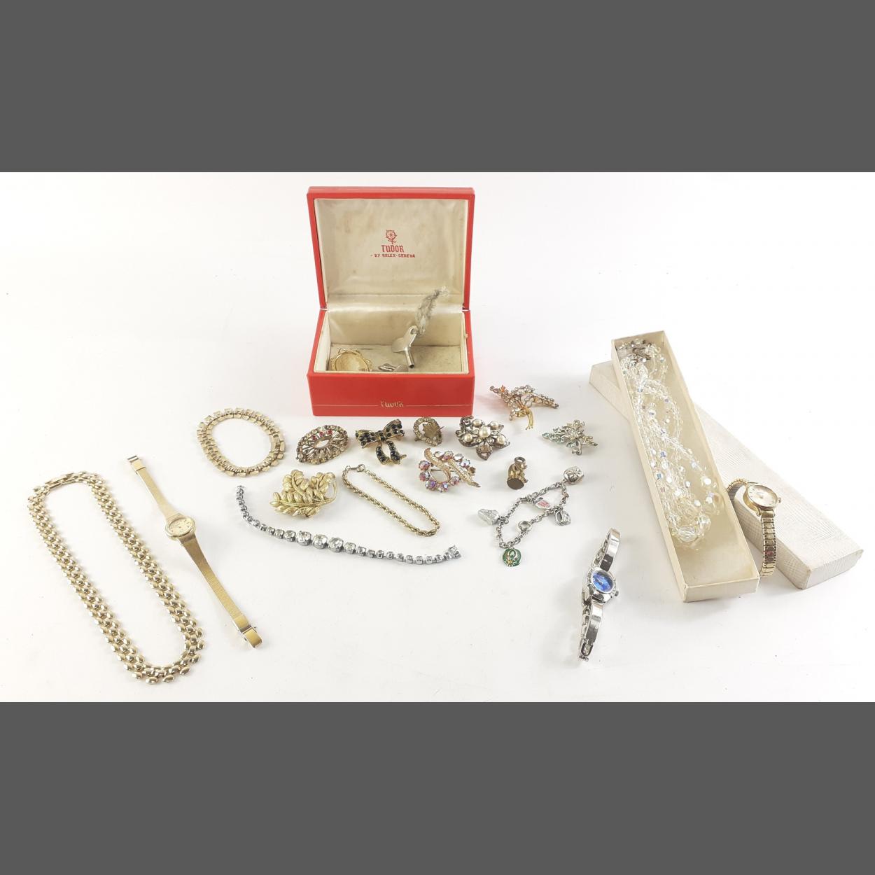 A small collection of jewellery including brooches, beads, cocktail watches etc. Some very pretty pieces.