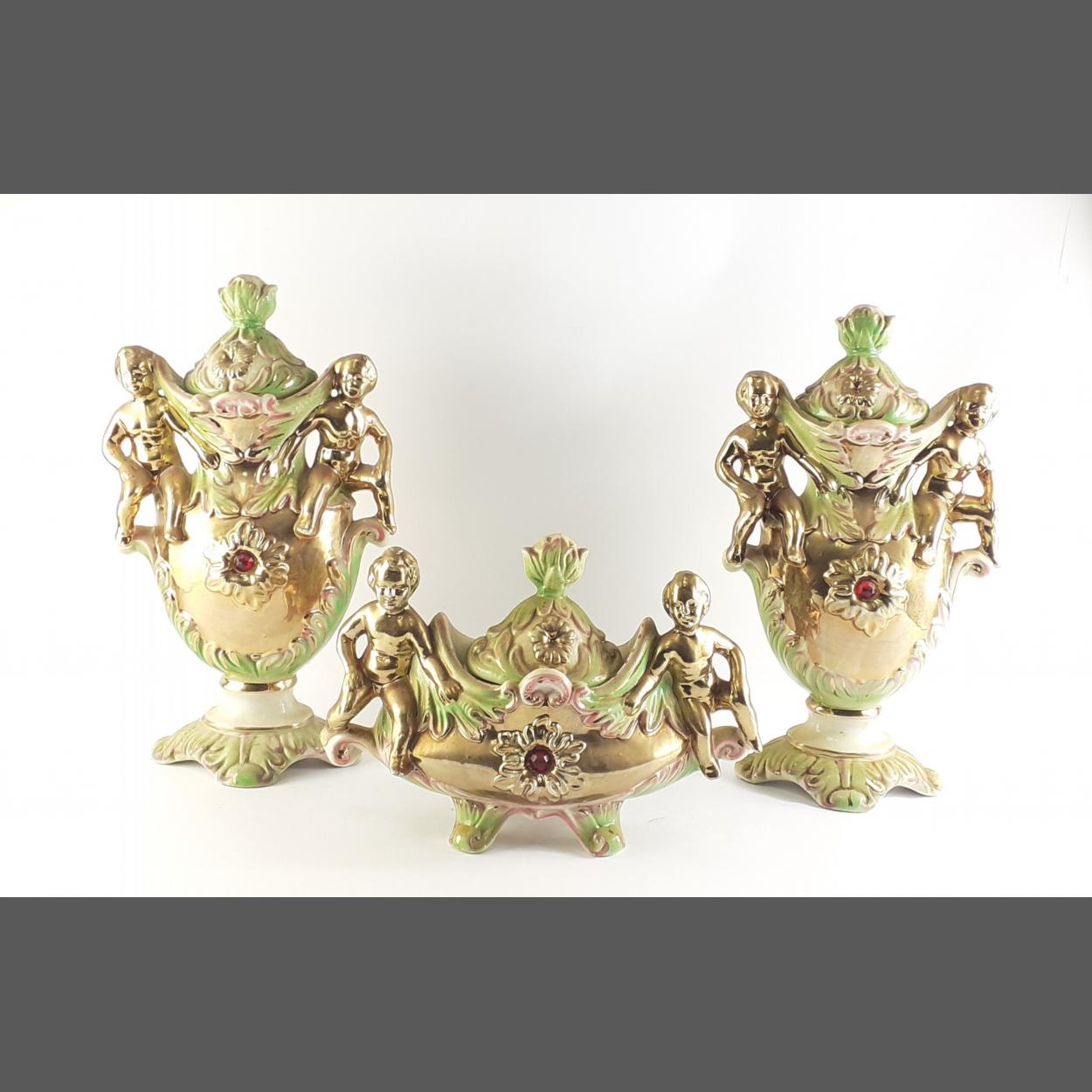 An unusual highly decorated trio of two lidded urns and a smaller lidded bowl. The taller 40cm approx. Highly gilded cherub style figures with imitation centre stones. Minor damage noted and some rubbing to gilding.