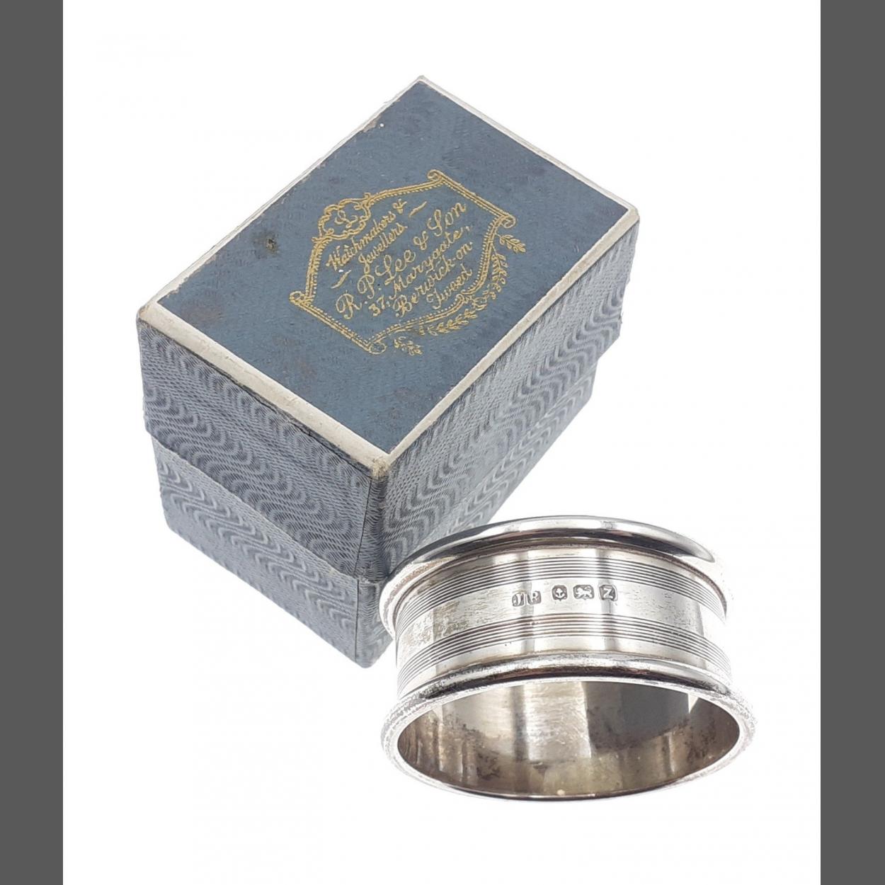 A boxed napkin ring with hallmarks for Birmingham 11.7g approx, in lovely condition.