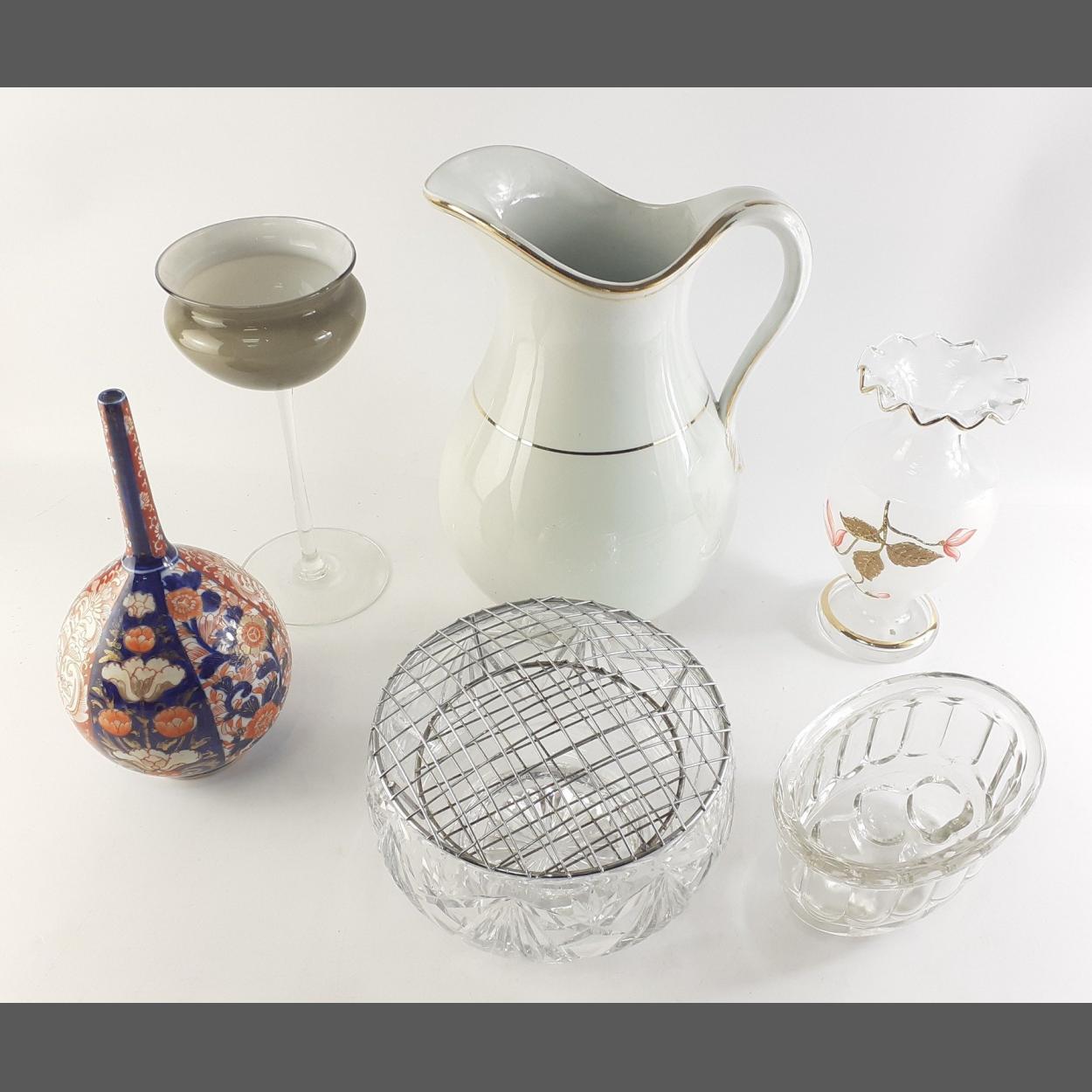 A mixed decorative lot to include an Imari style posy vase 25cm, a very pretty glass vase, a rose bowl, a large ewer and others.