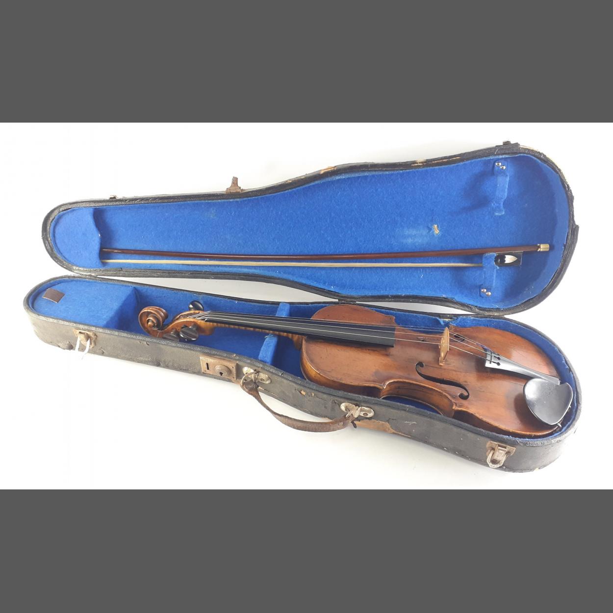 A cased antique violin with internal label stating Antonius Stradiuarius cremoncusis faciehad anno 1721 made in Bohemia. In hard case, no bow present. 55cm length approx.